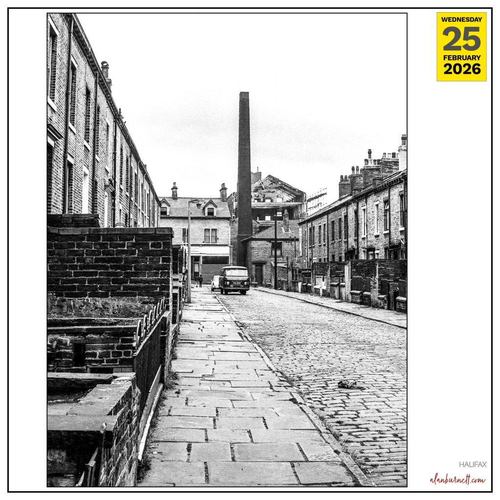 My photograph dates back to the early 1970s and shows one of those streets near the bottom of Lister Lane and Hopwood Lane in Halifax. The precise location doesn’t matter – it could be any lane in almost any northern town: with cobbled streets and an obelisk of a mill chimney.