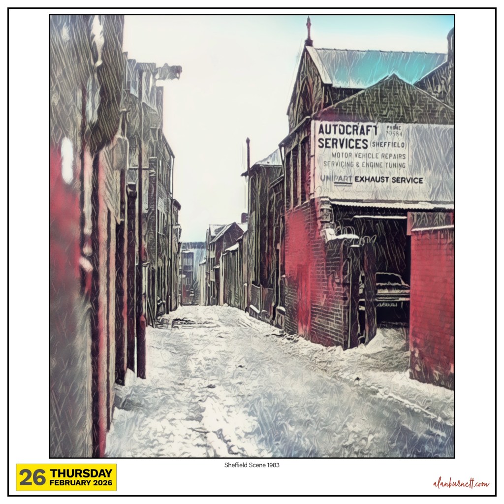 I took the photograph back in the early 1980s, and I messed around with it early yesterday. It snowed a lot back in the early ’80s, and I wandered up and down the back streets of Sheffield taking photographs. It was the shapes that attracted me then, and they still attract me now. Sheffield shapes.