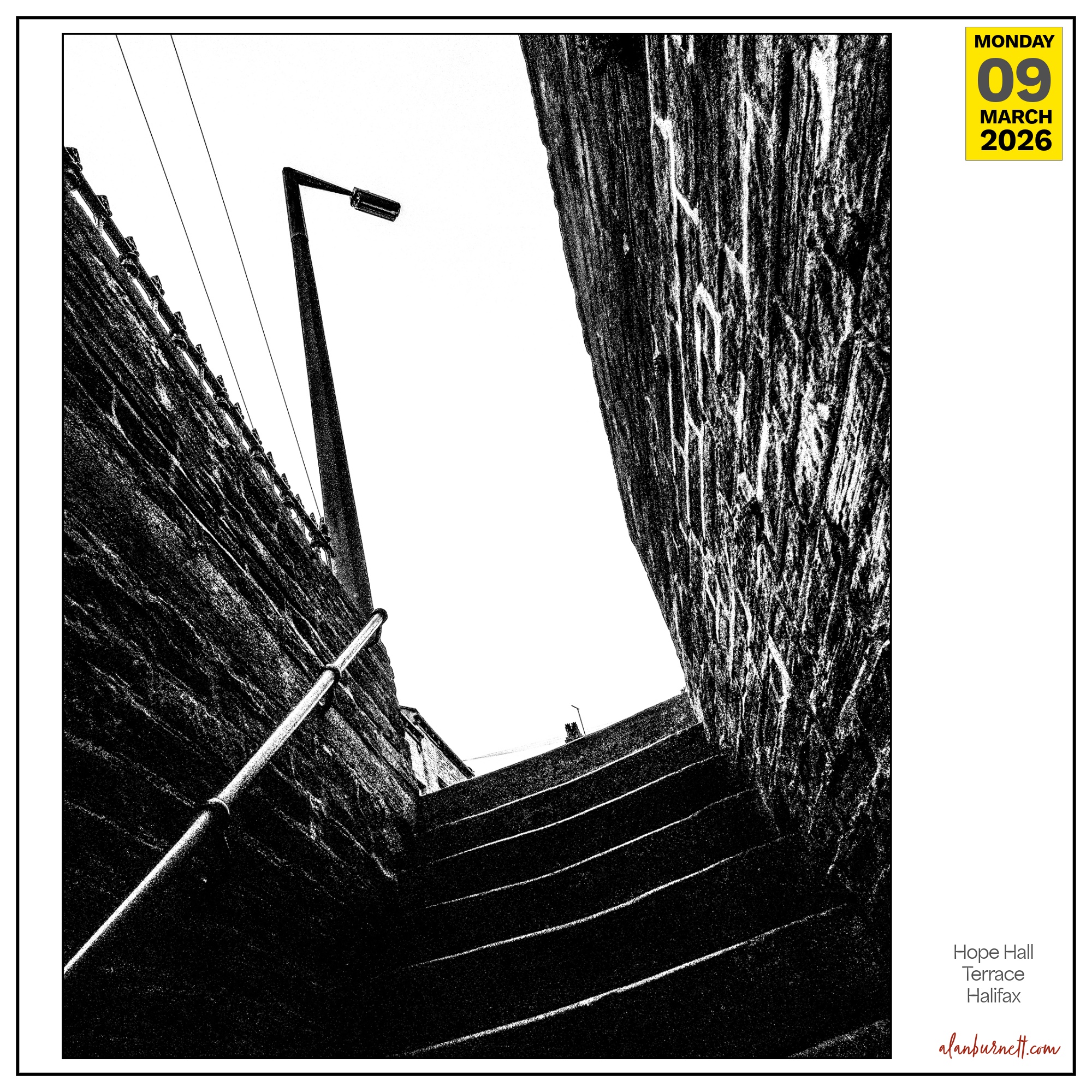 Yes, it’s a bit dark, but the world is a bit dark at the moment. The question has to be: are the steps leading us into or out of the darkness? I took the photograph on Hope Hall Terrace in Halifax. Enough said.
