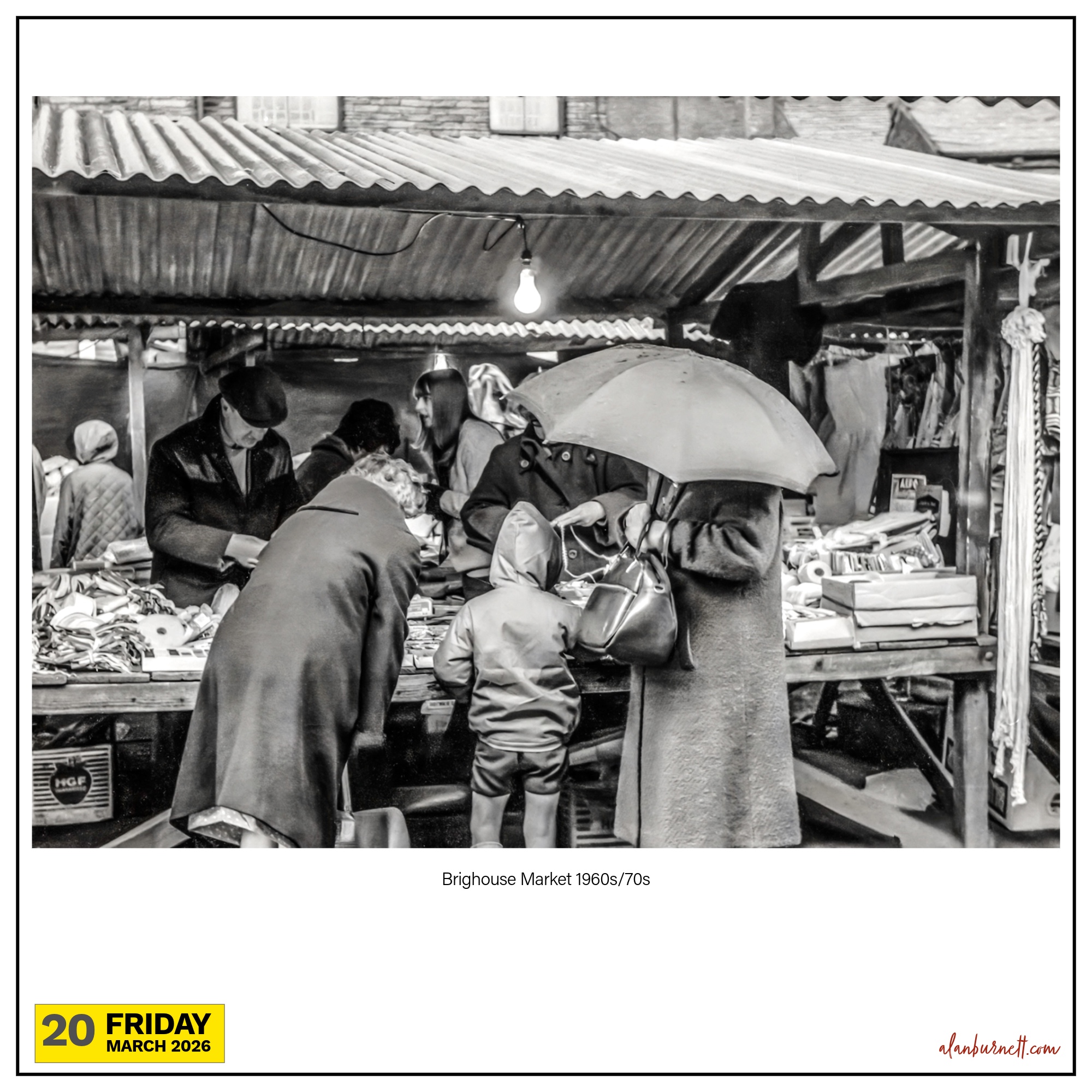 This photograph comes from the same strip of negatives as the one I featured yesterday and, we now know – thanks to research by Paul Hartley and Michael Horsfield – was taken back in 1967/68. It shows the old Brighouse Market, not far from where the bus station is today. This was back in the day when markets were markets (corrugated steel and light bulbs hanging by a wire), men were men (donkey jackets and flat caps) and women carried bags big enough to hold a stone of potatoes.