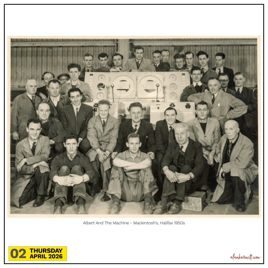 The photograph was taken 70 years ago at Mackintosh’s factory in Halifax. It shows a group of mechanics and engineers proudly gathered around the latest wrapping machine they have installed. My father, Albert, appears to be the proudest of the lot (seated just to the left of centre). The machine looks like it could launch a rocket; in fact it could wrap a strawberry delight or a toffee finger.